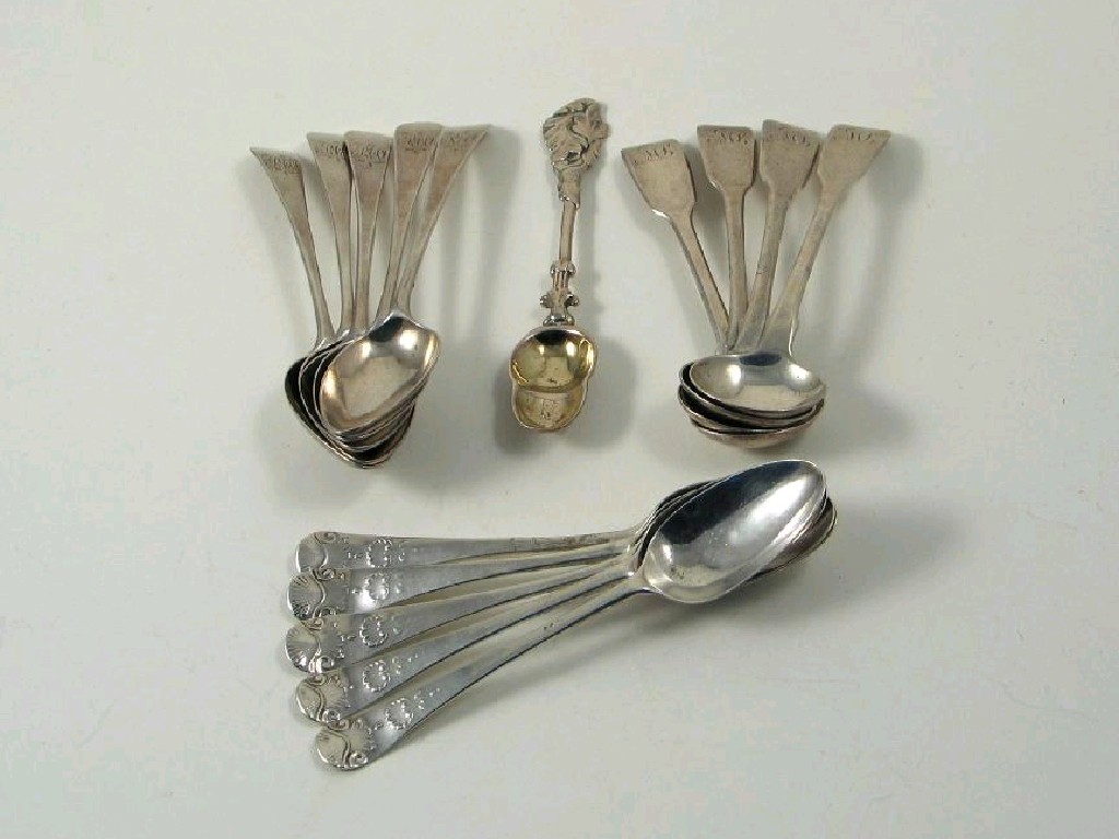 A mixed lot of spoons, comprising: a William IV teaspoon with an acorn bowl, by Joseph Angel, London 1832, a set of Newcastle made teaspoons by Christian Reid c.1800, a set of four George IV fiddle salt spoons by Richard Crossley, London 1828, and a set of five George II fancy back teaspoons by Elias Cachart, 5.5oz. (15)