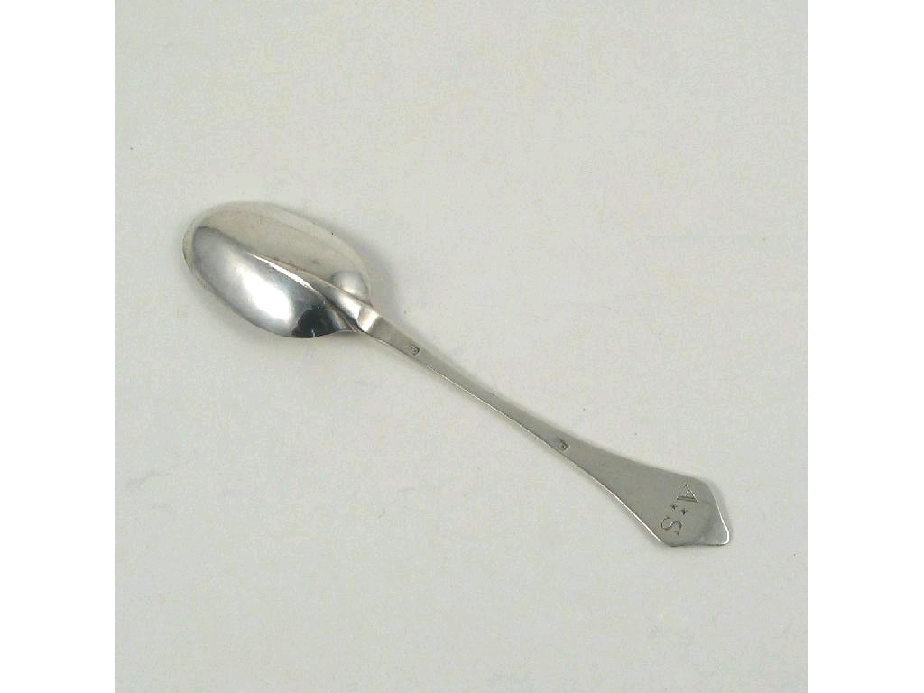 A Queen Anne unascribed wavyend dessert spoon, with a plain rattail, scratched 'AS' on the terminal, makers mark only, struck twice, 'TO', probably provincial, c.1710, 0.5oz.