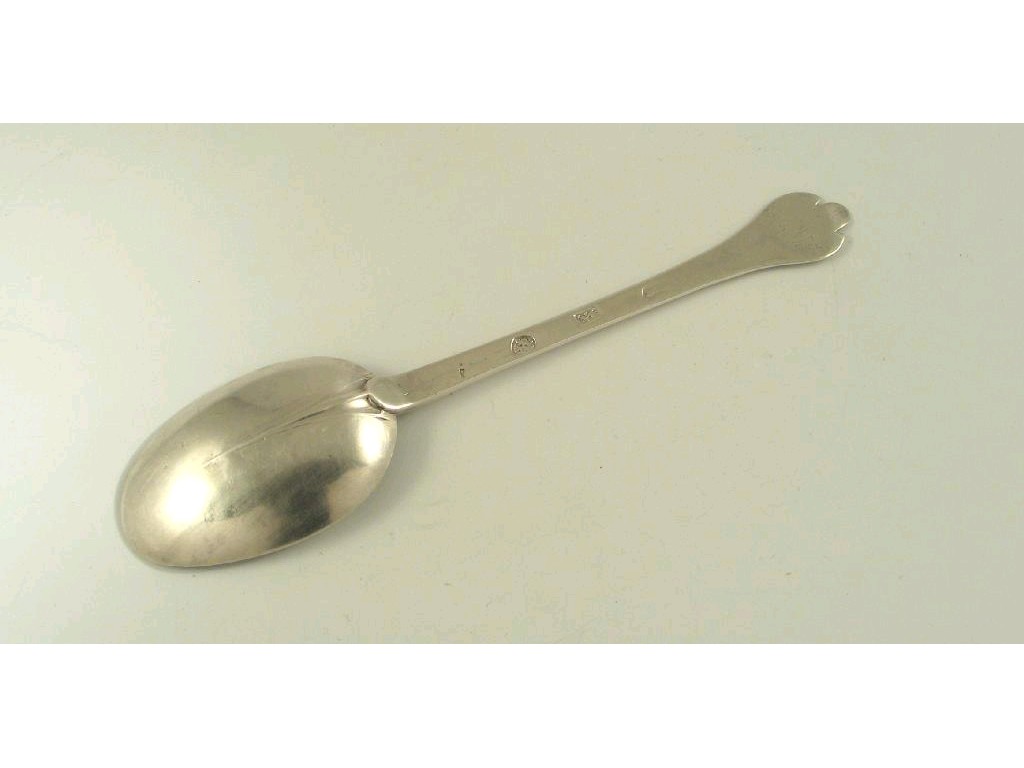 A James II trefid spoon, scratched 'MF' on the back of the terminal, makers mark worn, possibly by Lawrence Coles, London 1688. 7.25in (18.5cm) long. 1oz