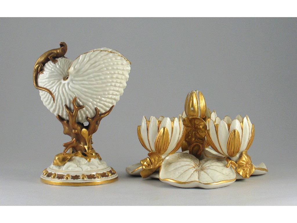 A Royal Worcester nautilus shell vase, applied with a lizard, and a Royal Worcester vase formed as three water lilies. Some damage. Both late 19th century, 25cm. Max. (2)