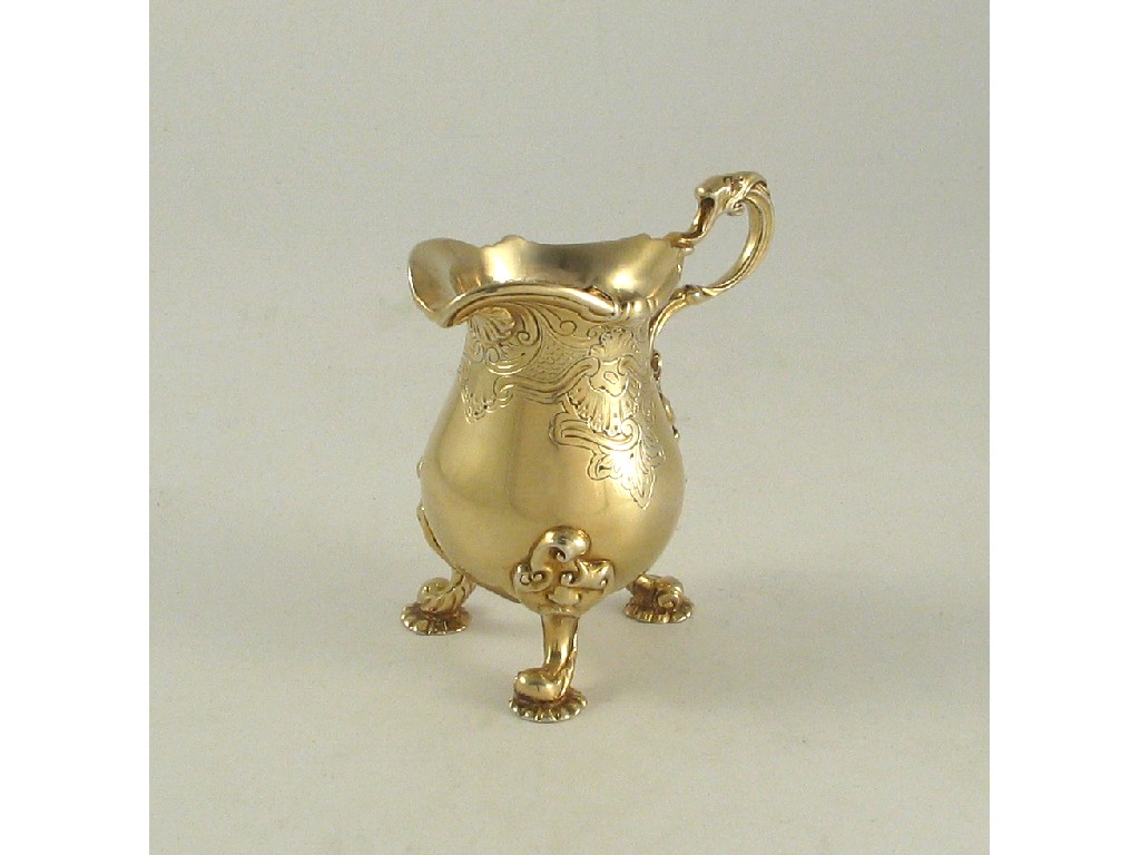 A modern cast silvergilt cream jug, after George II design, with masked scroll legs and shell feet, with as chased, upper body by Carrington and Co Ltd, London 1914, 4in, (10cm)high, 6oz.
