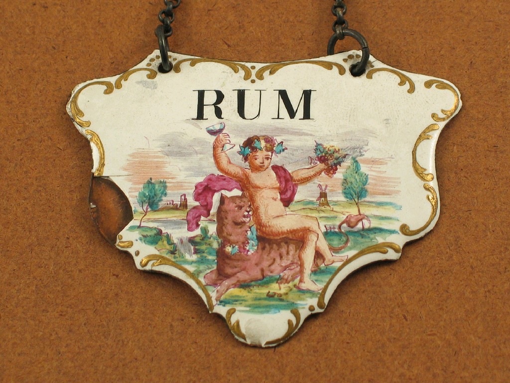 A rare mid 18th century enamelled copper wine label, of escutcheon form painted with a carmsing pulto sitting astride a big cat, in a landscape with a tower and a windmill in the background, with in a gilt scroll border, titled 'RUM', probably midlands, Staffordshire or Birmingham, c.1750 (some damage), 2.8in (7.3cm)wide.