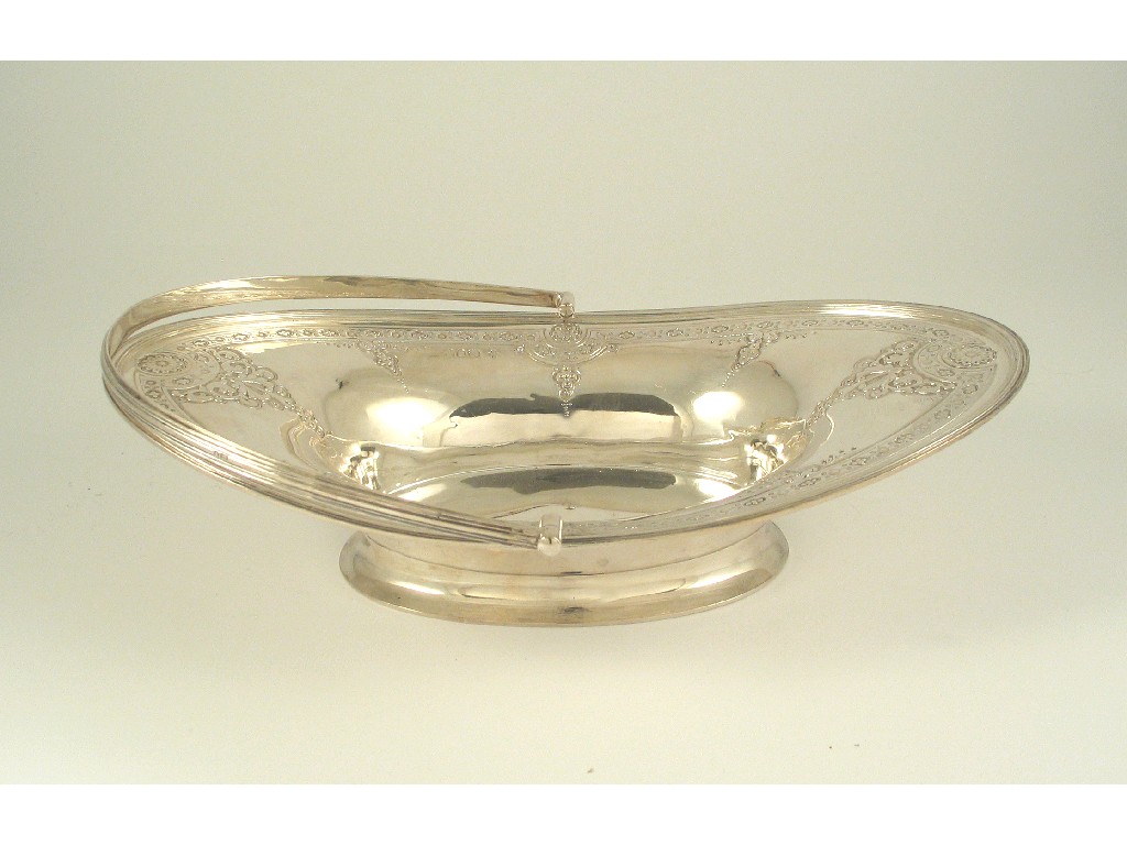 A late Victorian swing handled fruit basket, oval with borders of stamped and chased decoration by H. Woodward and Co, Sheffield 1894, 12.25, (31cm)wide, 16oz.