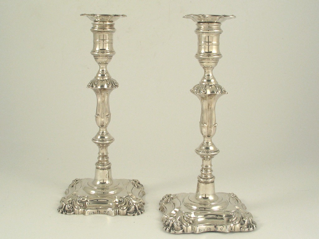 A pair of Edwardian Scottish candlesticks, on sloped square bases, with spool shaped capitals and shell decoration at the corners by Hamilton and Inches, Edinburgh 1901, 9.5in (24cm)high. (2)