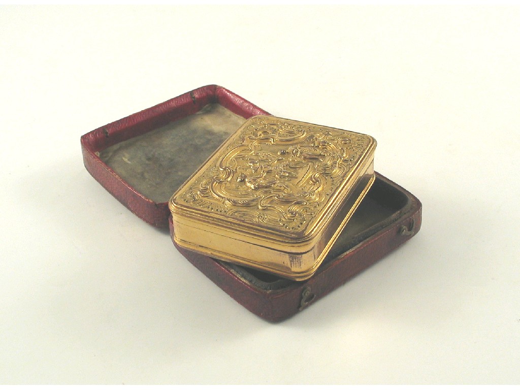 An early 19th century gilt metal oblong snuff box, with rounded corners, the cover with an inset plaque depicting a figural scene with a subject kneeling before the emperor, in relief within a scroll cartouche, c.1810 (in original fitted Morocco leather case) 3.3in (8.5cm) wide.
