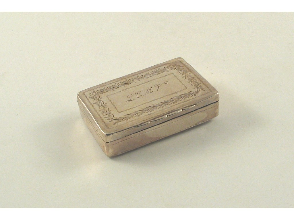 South African interest: an early 19th century South African oblong snuff box, with bright engraved foliate borders and pricked, initialled 'L.C.M.V.' by Lawrence Holme Twentyman of the Cape 1820-30, 3in (7.5cm) wide. 2.7oz