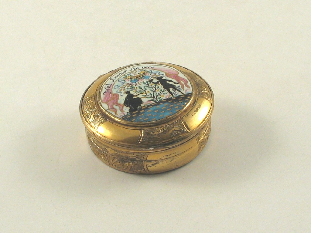 A mid 18th century gilt metal circular snuff box with a tortoiseshell base, chased reserves of flora and fauna, the cover inset with a Berlin enamel plaque titled 'Nul Amour San Gere,' with encrustations, unmarked c.1740. 2.5in (6.5cm) diameter.