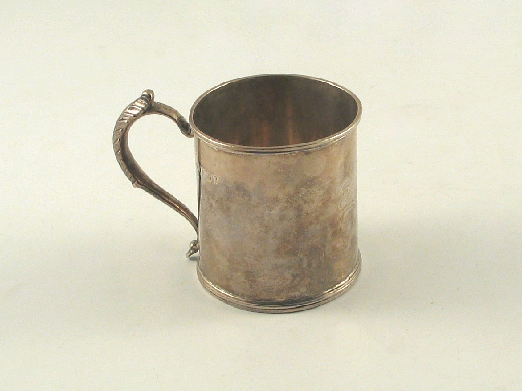 South African interest: an early 19th century South African cylindrical mug, with a foliate scroll handle, inscribed 'Edith Mary,' by John Townsend of the Cape 1830-40, 3.75in (7cm) high. 4.25oz.