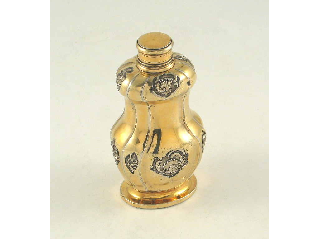 An early 20th century Danish silver gilt toilet flask, decorated with chased reserves and an applied cipher, screw cover, by DC.F. Halsberg (retailed by Michelson) Copenhagen 1908, 4.9in (12.5cm) high. 5oz