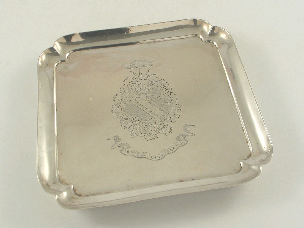 A late Victorian square salver, with incurved corners and bracket feet, engraved coat of arms, crest and motto 'EST MERUISSE SATIS,' by Charles Boyton, London 1890. 7.25in (18.2cm) 11oz