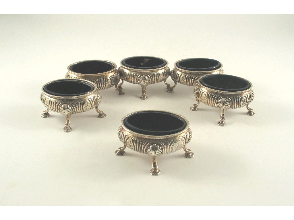 A matched set of six George III oval salts, on low legs with chased fluting around the sides and an engraved cypher, by Robert & David Hennell, London 1763/70, (blue glass liners) 3.5in (9cm) wide, 15oz weighable silver. (6)