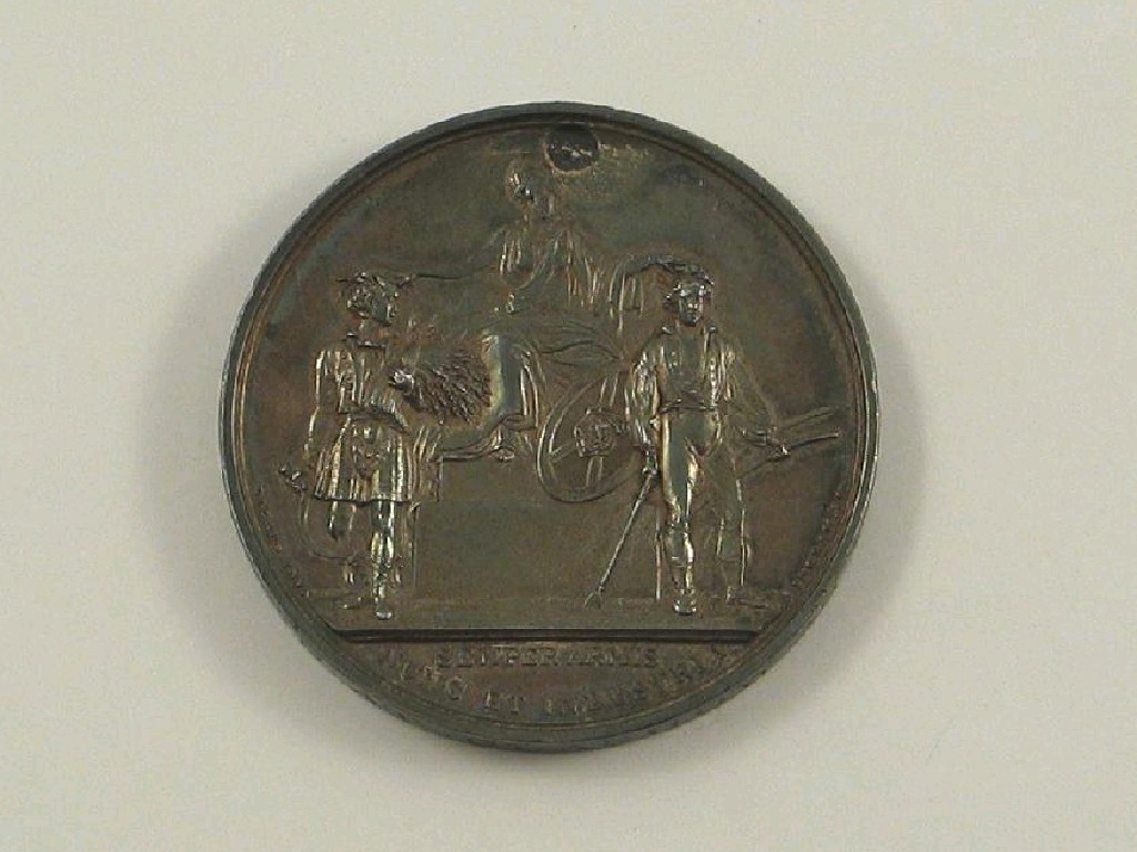 Highland Society of Scotland , silver prize medal, by Lizars and Ingram, awarded 1829, Scotia with two Highland labourers, rev . legend and wreath, "To Mr. Andrew McOnie", and on edge, "For a Cow Shewn at Glasgow as Extra Stock", 41mm. Very fine .
