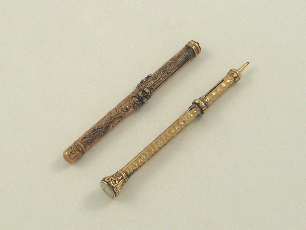 A Victorian gold cased telescopic pen cum pencil, inscribed "F. Company Prize 1877 won by Private Thomas Stout", together with another Victorian gold cased column pencil. (2)