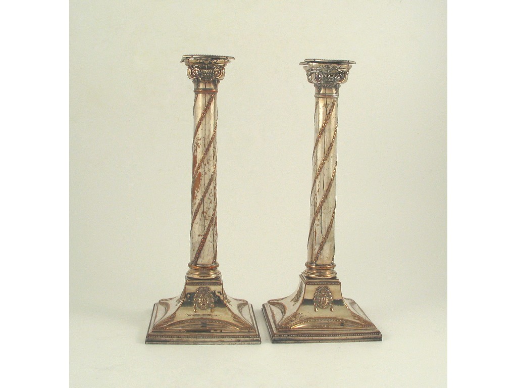 A pair of Old Sheffield plated column candlesticks, with bead borders, bevelled square bases and garlands of foliate festoons around the columns, c.1795. 12in (30.5cm) high