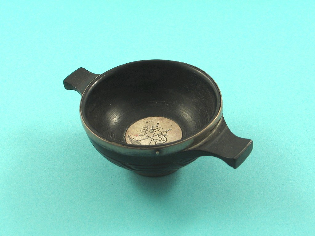 A late Victorian mounted hardwood quaich, carved around the sides with stylized knots and engraved on the boss with crossed gold clubs and " FAR AND SURE " unmarked, c.1900, 4.1in (10.5cm) wide.