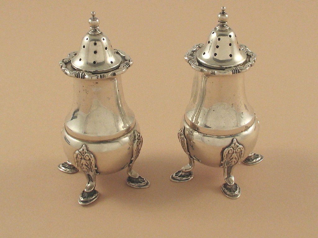 A pair of modern pepperettes, on four feet, by E.W. Haywood, Birmingham 1948. 4.2in (10.5cm) high. 6oz.