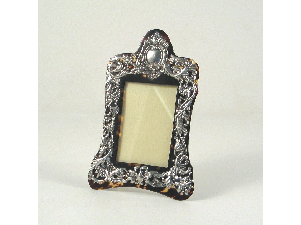 A late Victorian mounted tortoiseshell frame, with a plated easel back, the mount hallmarked Birmingham 1891, 6in (15.25cm) high, probably an alteration.