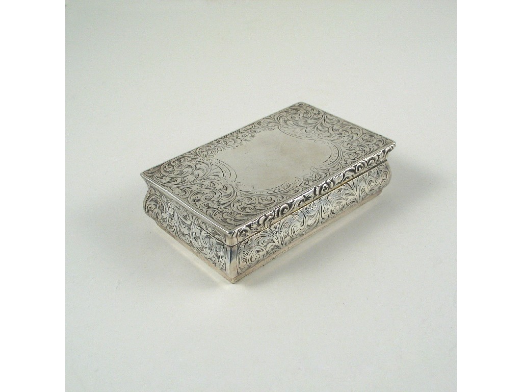 A Victorian large engraved snuff box, oblong, with bombe sides, a vacant shield cartouche on the cover and gilt interior by Thomas Dones, Birmingham 1853, 4in (10cm)wide, 5.25oz.