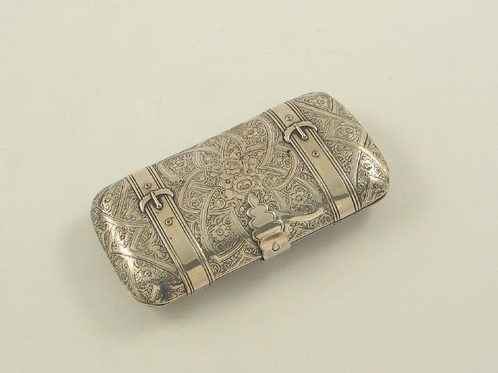 A Victorian purse or case, in the form of a strapped parcel with a latch opening and floral engraving, by George Unite, Birmingham 1862, 5in (13cm) long.