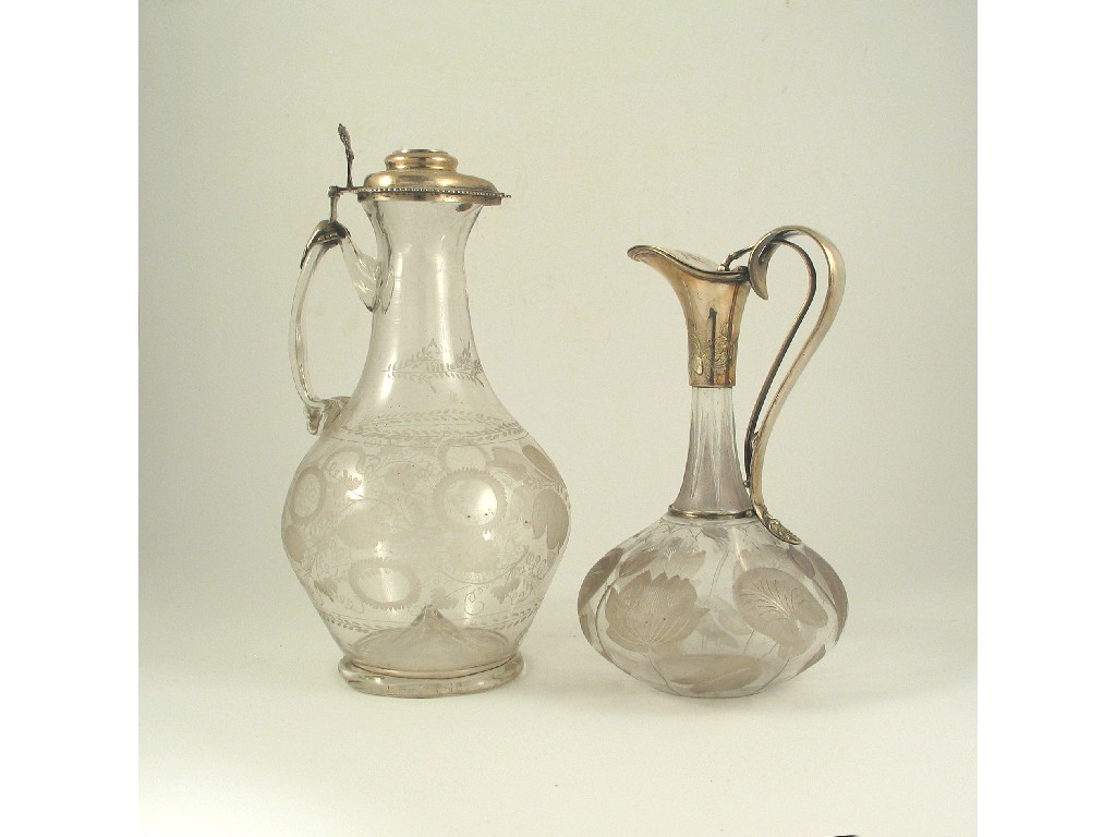 A continental mounted clear glass wine flagon, with wheel cut decoration (crack in base) and a Victorian plated mounted glass claret jug etched with lily flowers, the larger jug 12.5 inches (32cm) high, (2)