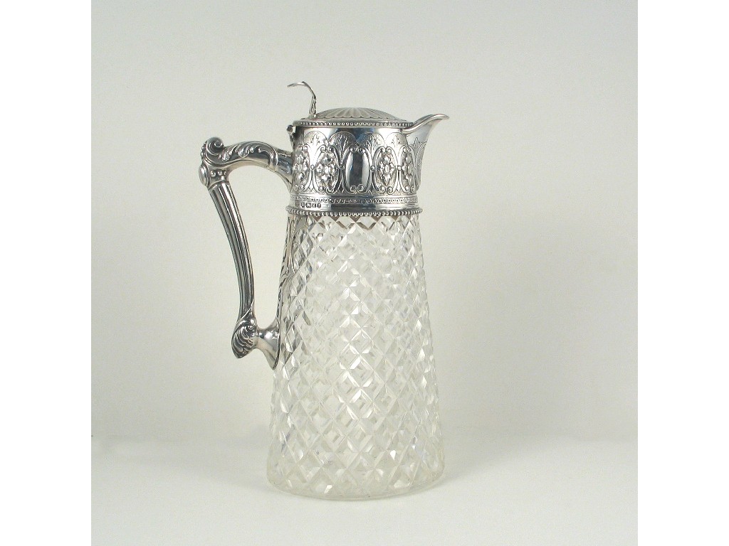 A Victorian mounted cut glass claret jug, with a tapering oval body and embossed mount, by W and G Sissons, Sheffield 1877, 9.7in, (24.5cm)high.