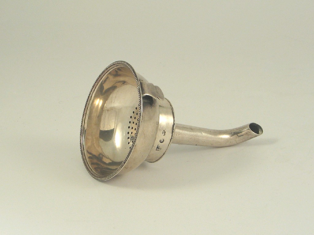 A George III Irish wine funnel, with a shaped tang and beaded border, crested, makers mark 'IL?' possibly for John Laughlin, Dublin 1786, 4.5in (11.5cm)high, 2.5oz.