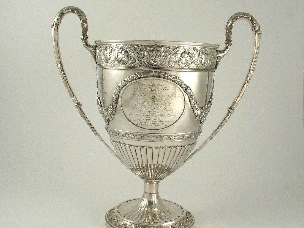 A George III two handled presentation cup of vase form, on pedestal foot decorated with part fluting, chased friezes of foliage and applied festoons of flowers, the front set with an oval plaque depicting a Royal Naval sailing ship engaging with the enemy, the back with a plain oval plaque, inscribed "To Captain John Maclean commander of the ship Duke of Buccleugh, of London in testimony and as a memorial of his distinguished bravery and good conduct, having in two sperate engagements, the one on the 7th October 1794, the other on the 11th March 1795, in both of which he fought with with a force far inferior to that of the enemy, saved the above ship from being captured by the French. This cup is presented with all the gratitude and esteem by his obliged servants John and Alexander Anderson", gilt interior crested by William Holmes, London 1795, 13.5in, (34.5cm)high, 77.5oz.