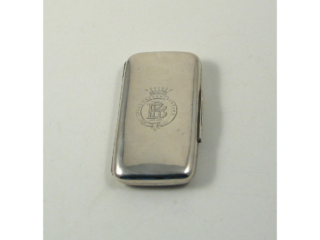 A Victorian cigarette cum vesta case, with a spring clasp, with an engraved viscounts coronet, the initals 'RB' and motto 'Donec ivam certabo', gilt interior by Arnold Frankfeld, London 1884, 4in, (10cm), 3.5oz.
