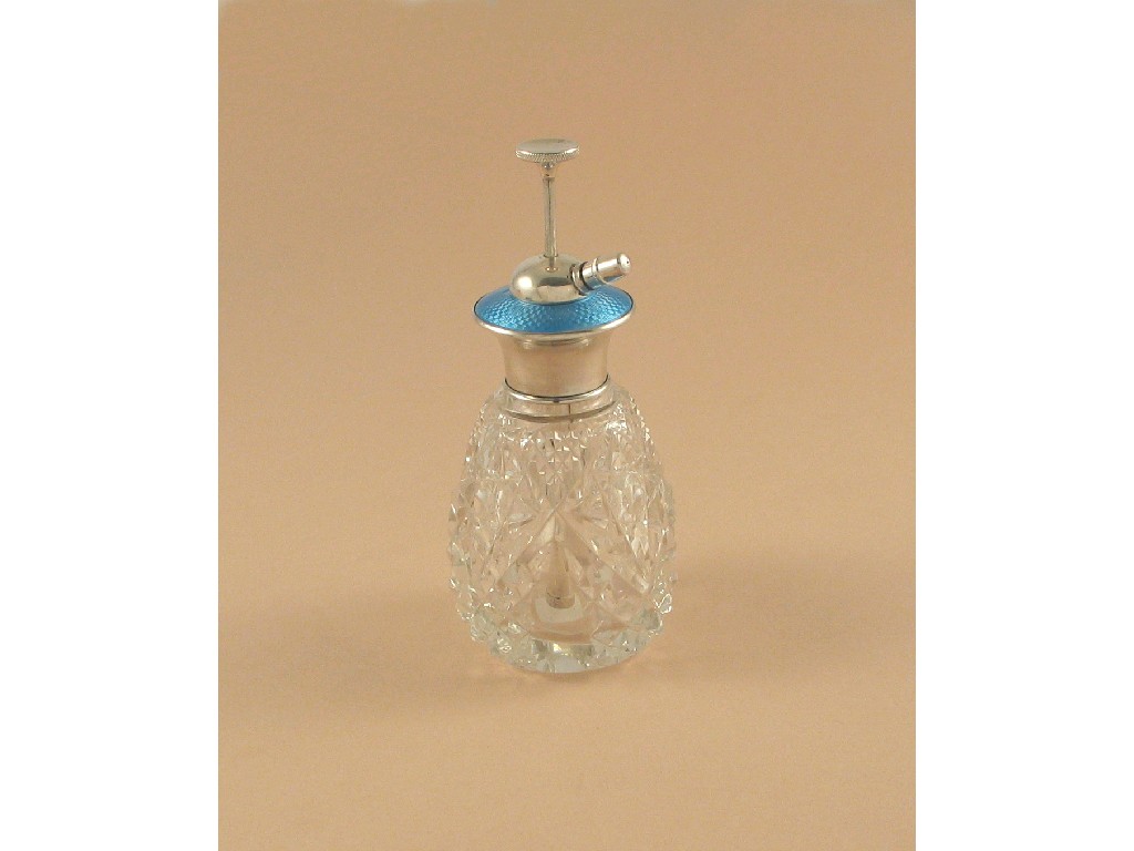 A modern mounted cut glass scent atomiser, with a blue enamelled cap and plated innards and plunger, by Adie Bros, Birmingham 1925. 5.75in (14.5cm) high, overall.