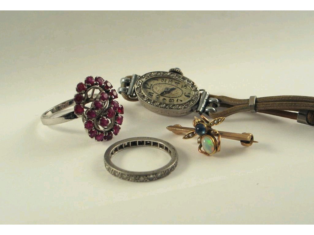 A diamond full circle eternity ring, set in platinum, size N; a diamond set cocktail wristwatch, platinum case; a small bee brooch, the opal, cabochon sapphire and seed pearls are set in gold, and a ruby set cluster ring.
