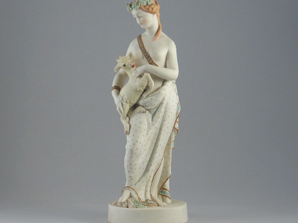 A large Goss Parian model of a wood nymph, holding a kid goat and decorated with enamel colours and gilding, printed mark, mid 19th century, 43cm.