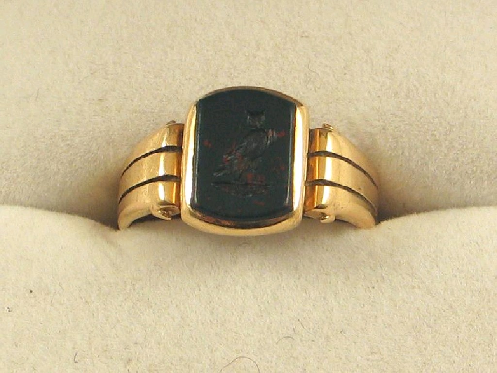 An 18ct gold signet ring, set with a bloodstone intaglio, carved to depict an owl.