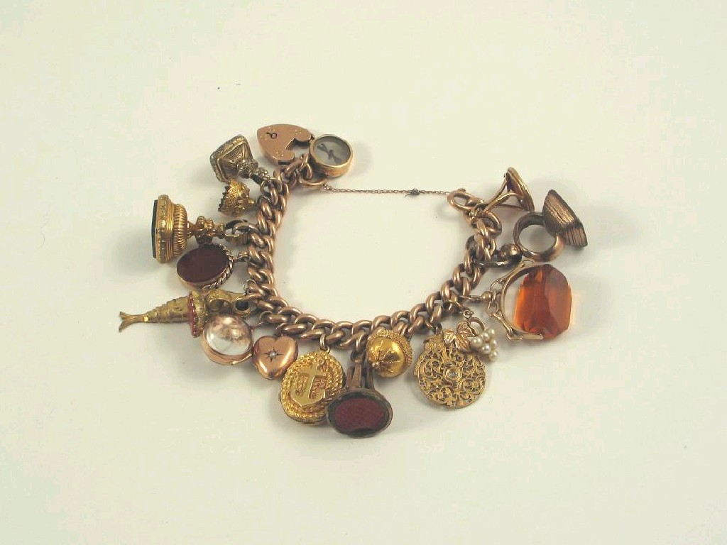 A gold curb link bracelet, with gold padlock clasp and mounted with assorted charms.