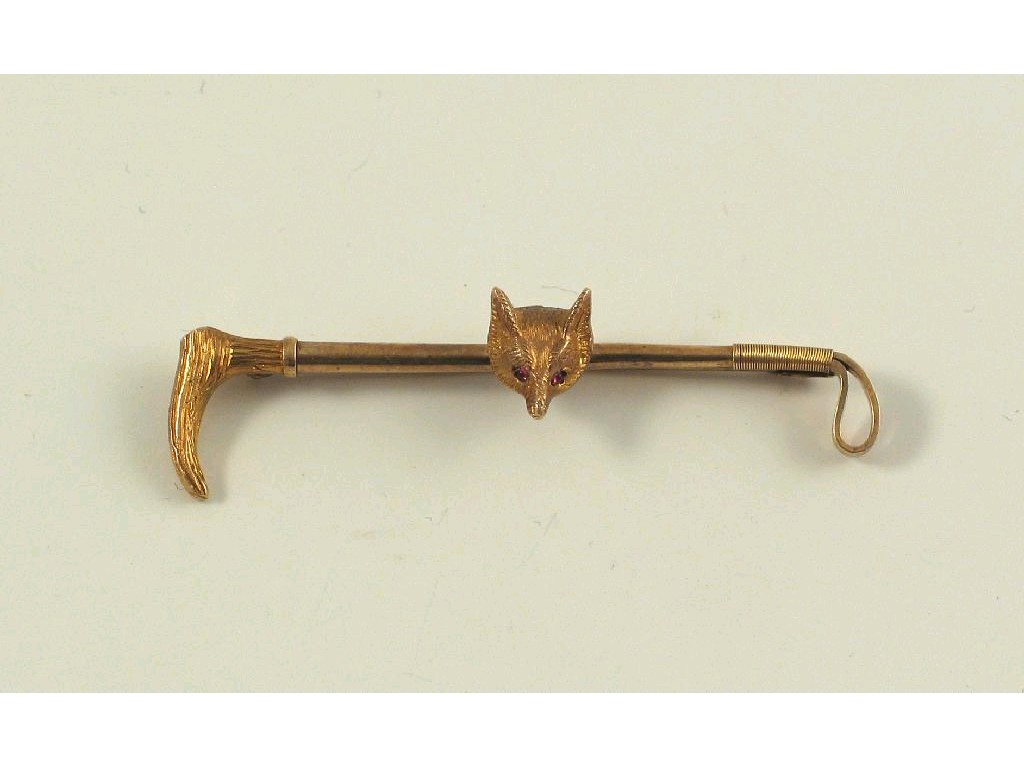 A 9ct gold bar brooch, in the form of a fox mask with ruby cabochon eyes, mounted on a riding crop. 6.1cm