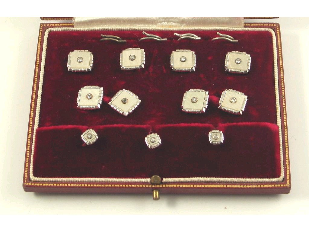 A gentleman's dress set, comprising four shirt buttons, a pair of cufflinks and three collar studs, each set a single diamond in a square mother of pearl and white gold mount, in a fitted case by Garrard & Co.