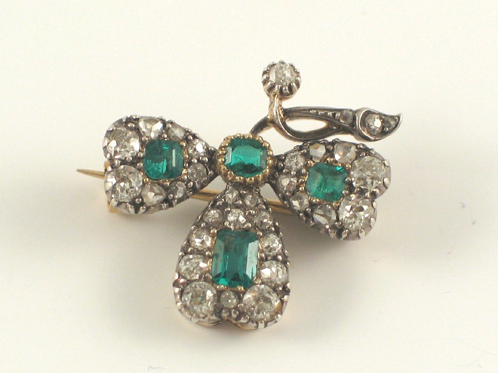 A Victorian shamrock brooch, each heart shaped petal centred with an emerald within a diamond surround, and centred with a further emerald, set in silver on gold.