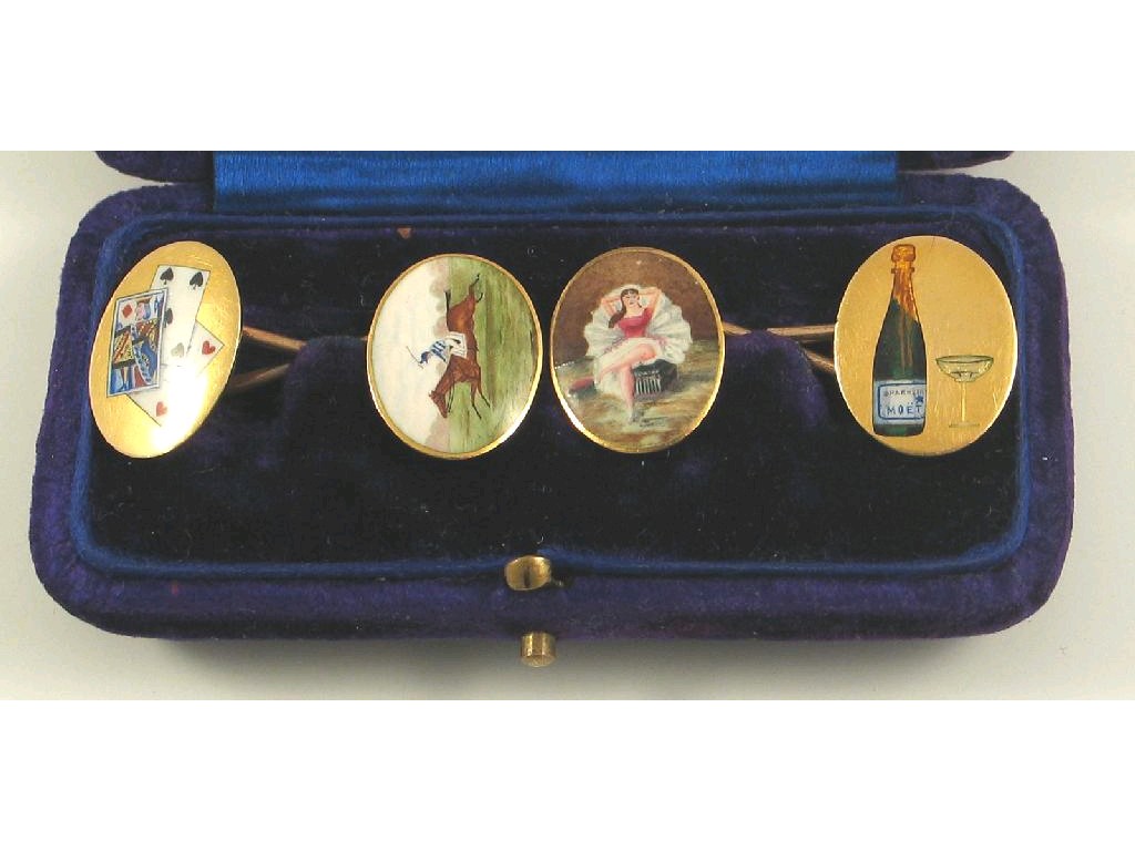 A pair of early 20th century enamelled gold cufflinks, the oval plaques depicting the 'four vices of man,' as playing cards, a race horse and jockey, a dancing girl and a bottle of Moet with glass, in 18ct gold with figure of eight links, case.
