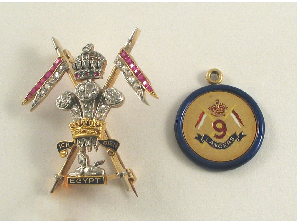 A gem set regimental brooch, for the 9th/12th Lancers, set overall with rose cut diamonds, rubies and emeralds and with blue enamel decoration, with a small gold and enamel medallion for the 9th Lancers.