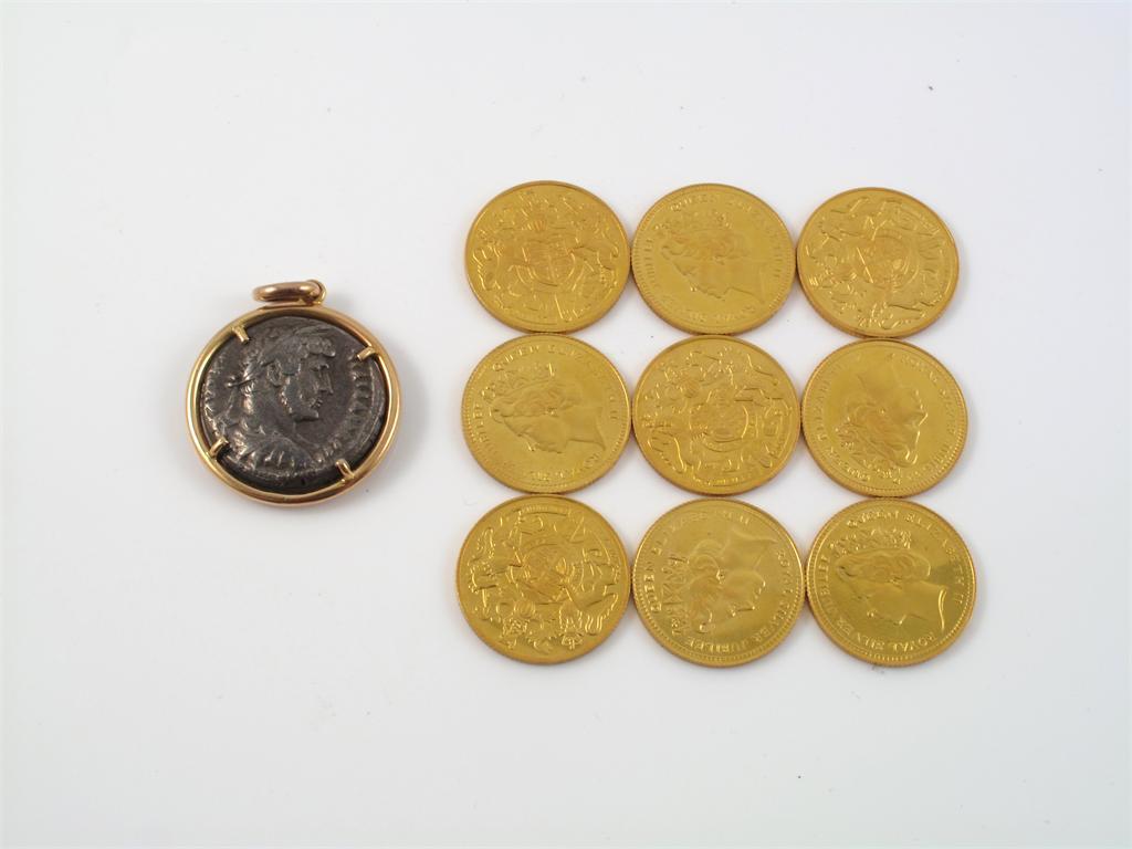 Nine 9ct gold commemorative medallions, 5.1g each. And a gold mounted ancient coin pendant.