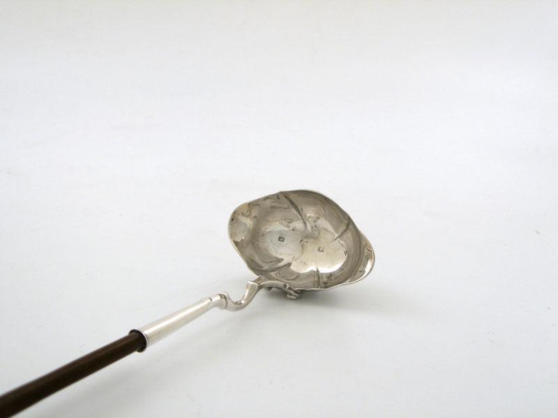 A George II silver toddy ladle, oval lobed form, engraved with a crest, wooden baluster handle, maker's mark worn, London 1736, length 32cm. approx. weight 2oz.