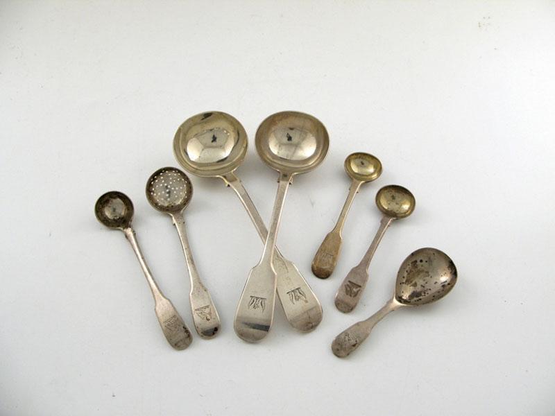 A small collection of silver Fiddle pattern flatware, comprising: a pair of sauce ladles and a salt spoon, by George Adams, London 1855 and 1856, a caddy spoon, a sifter spoon, a condiment ladle and a salt spoon, by William Eley, William Fearn and William Chawner, London 1814, engraved with a crest, approx. total weight 7oz. (7)