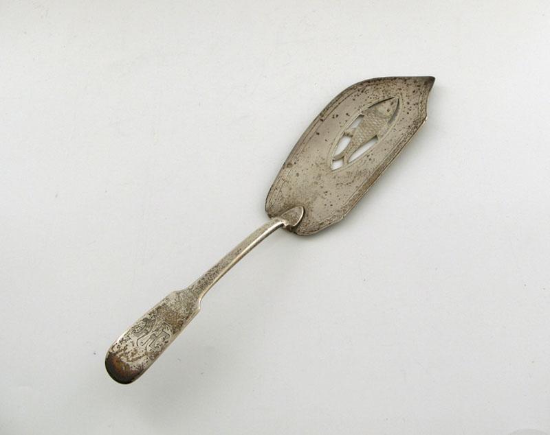 A George III fish Fiddle pattern slice, the blade engraved and pierced with a fish, initialled H R, by William and Samuel Knight, London 1813, 12in (33cm) approx. weight 4oz.