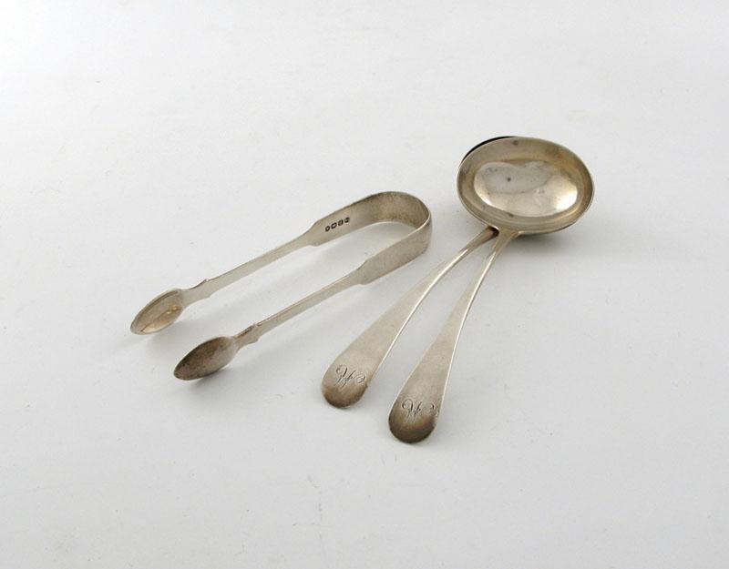 A pair of George III silver old English pattern sauce ladles, the terminals engraved with a monogram, by Peter and William Bateman, London 1809, plus a pair of George IV silver Fiddle pattern sugar tongs, London 1827, approx. total weight 4oz. (3)