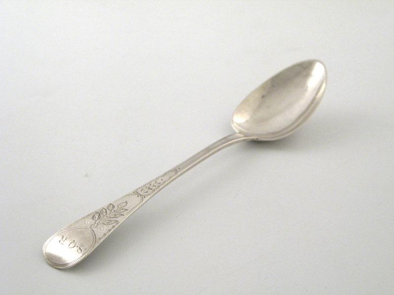 A Channel Islands silver Hanoverian pattern tablespoon, with bright-cut decoration, initialled 'S Q R', by Jacques Quesnel, Jersey c.1800, 1oz.