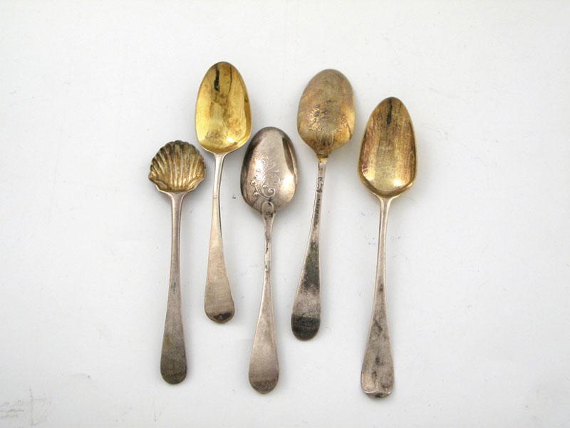 A set of five mid 18th century scroll back silver tea spoons, later gilded bowls, plus two mid 18th century picture back tea spoons, the reverse of the bowls with baskets of flowers, and a pair of salt spoons with shell bowls, approx. total weight 2oz. (9)