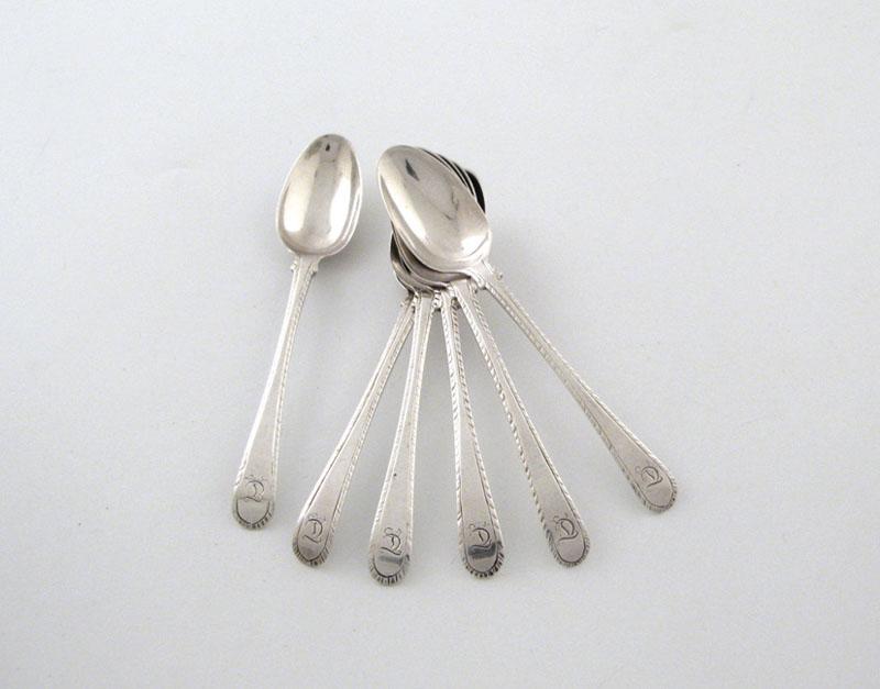 A set of six George III Old English pattern teaspoons, feather-edge, with shoulders, initialled 'T', by Richard Richardson, c.1780, approx. weight 2.5oz. (6)