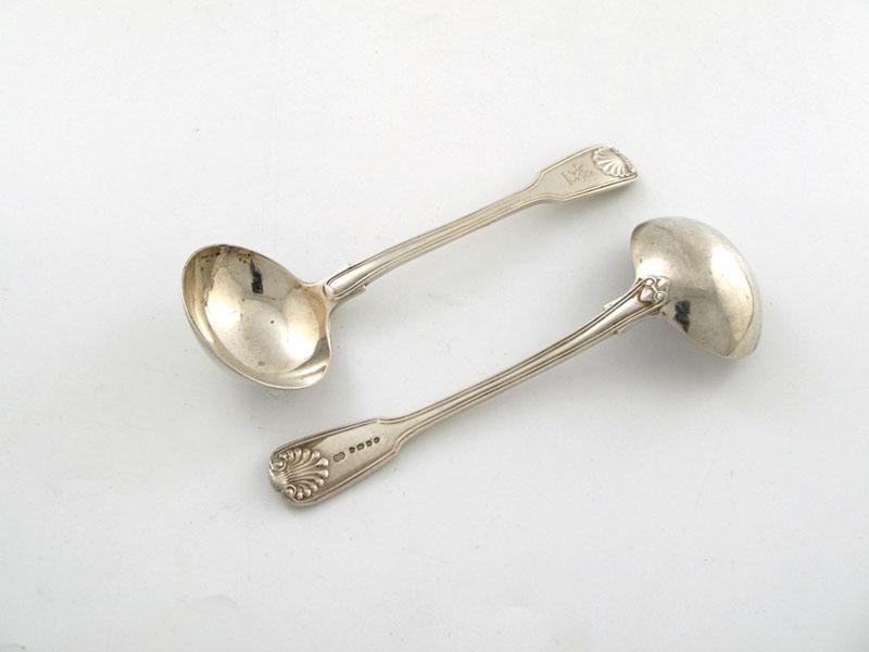 A pair of Victorian silver Fiddle, Thread and Shell pattern sauce ladles, the terminals engraved with a crest, by George Adams, London 1842 and 1844, approx. weight 4oz. (2)