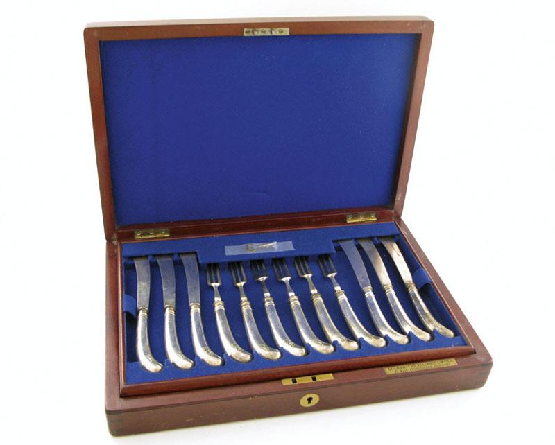 A plated 19th century canteen of dessert knives and forks, with pistol handles, initialled 'B', in a fitted mahogany box, inset cartouch monogrammed and dated 1888, with retailers plaque for 'Goldsmiths Alliance Limited 11 & 12 Cornhill, London'.