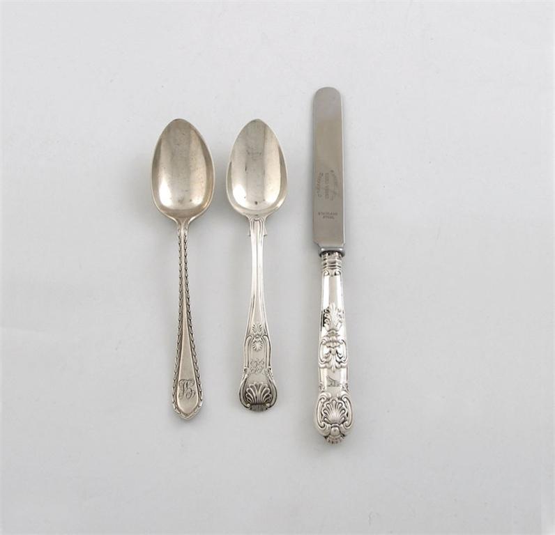 A mixed lot of silver flatware, various dates and makers, comprising: five King's pattern tea spoons, and another King's pattern tea spoon, plus six dessert knives, and a tea spoon. (13)