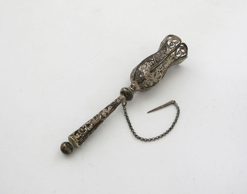 A Victorian silver posy holder, of pieced hexagonal baluster form, engraved scroll decoration, tapering handle, unmarked, circa 1860, length 16cm.